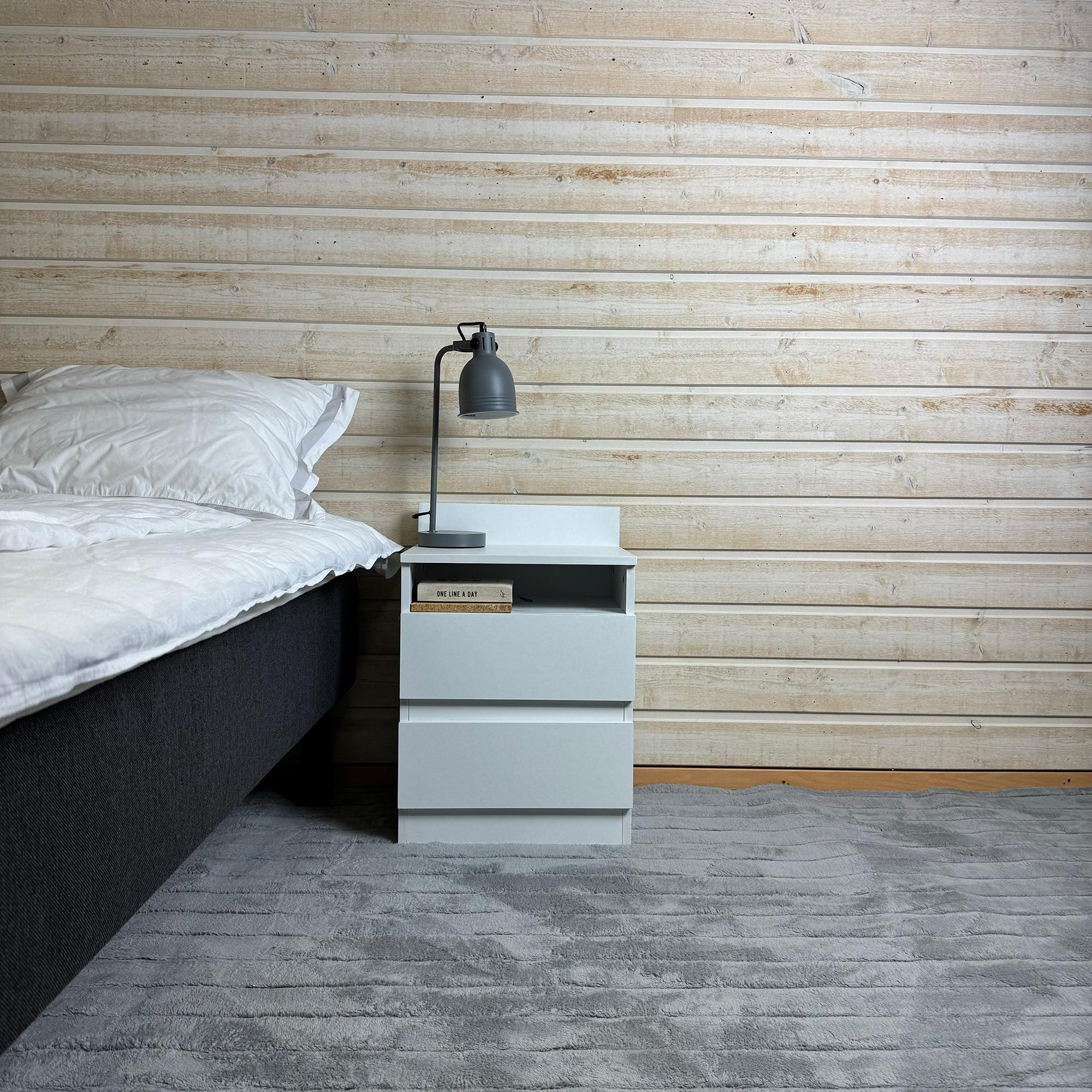 Modernne ja kompaktne valge öökapp Malmi kahe sahtli ja avatud riiuliga. Skandinaavialik minimalistlik disain, mis sobib igasse magamistuppa.