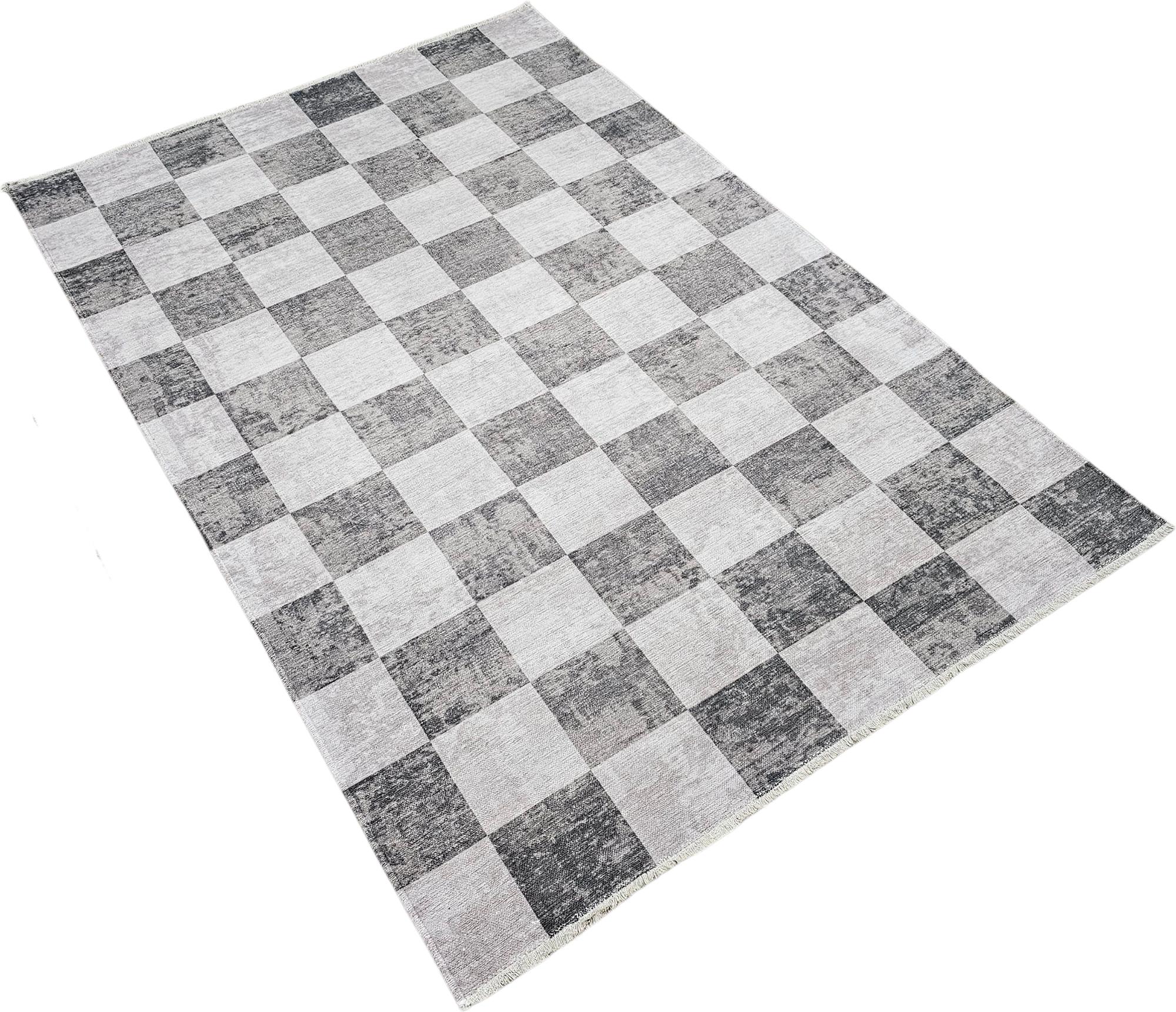 Ruutu-vaip mõõdus 160 × 230 cm ühendab selge geomeetrilise mustri ja neutraalse halli värvitooni, sobitudes hästi nii modernse kui klassikalise sisustusega.