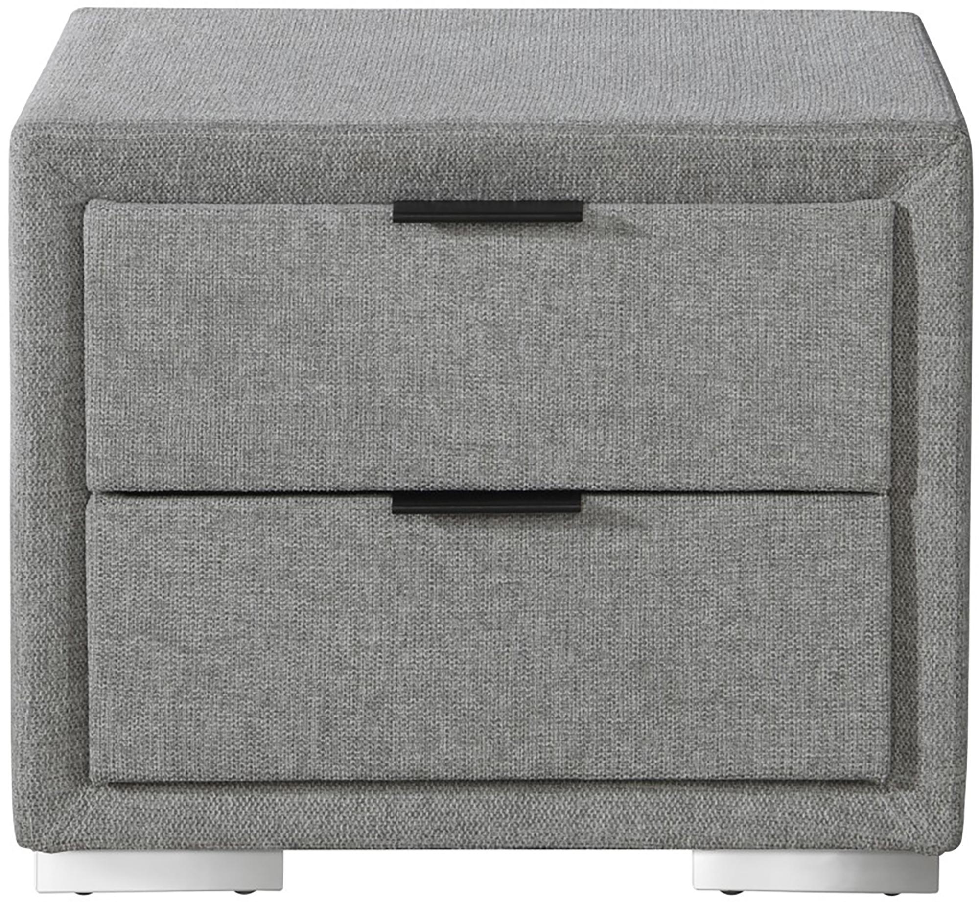 Kaasaegne hall kangaga kaetud öökapp kahe sahtliga, mis ühendab pehme ilme ja praktilise hoiuruumi.