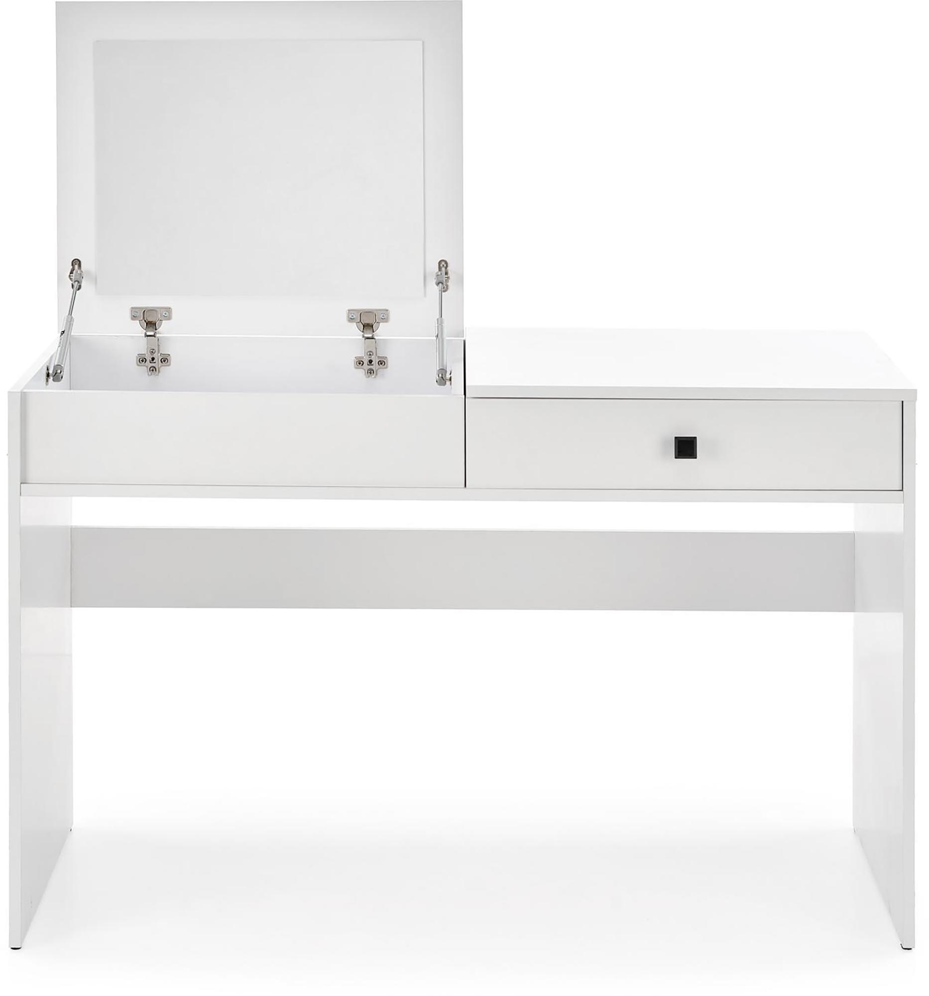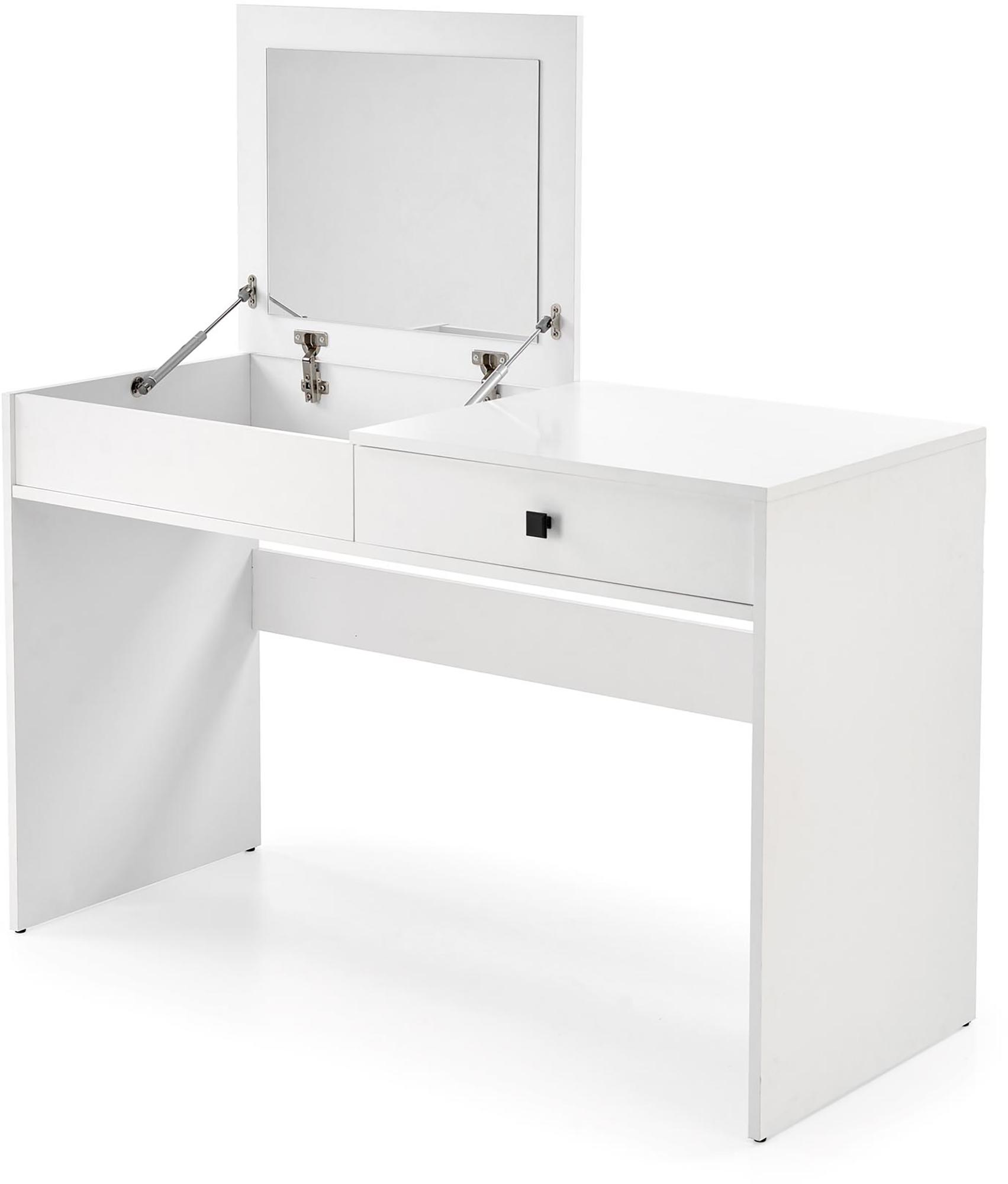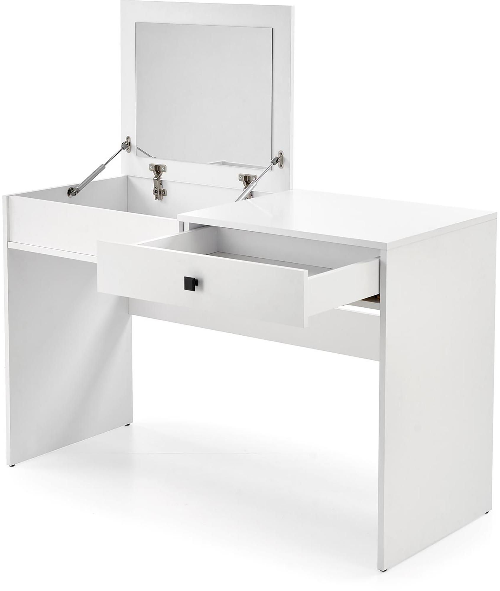 Valge kergesti hooldatav meigilaud, millel on tõstetava kaanega peegel ja mitu praktilist panipaika.