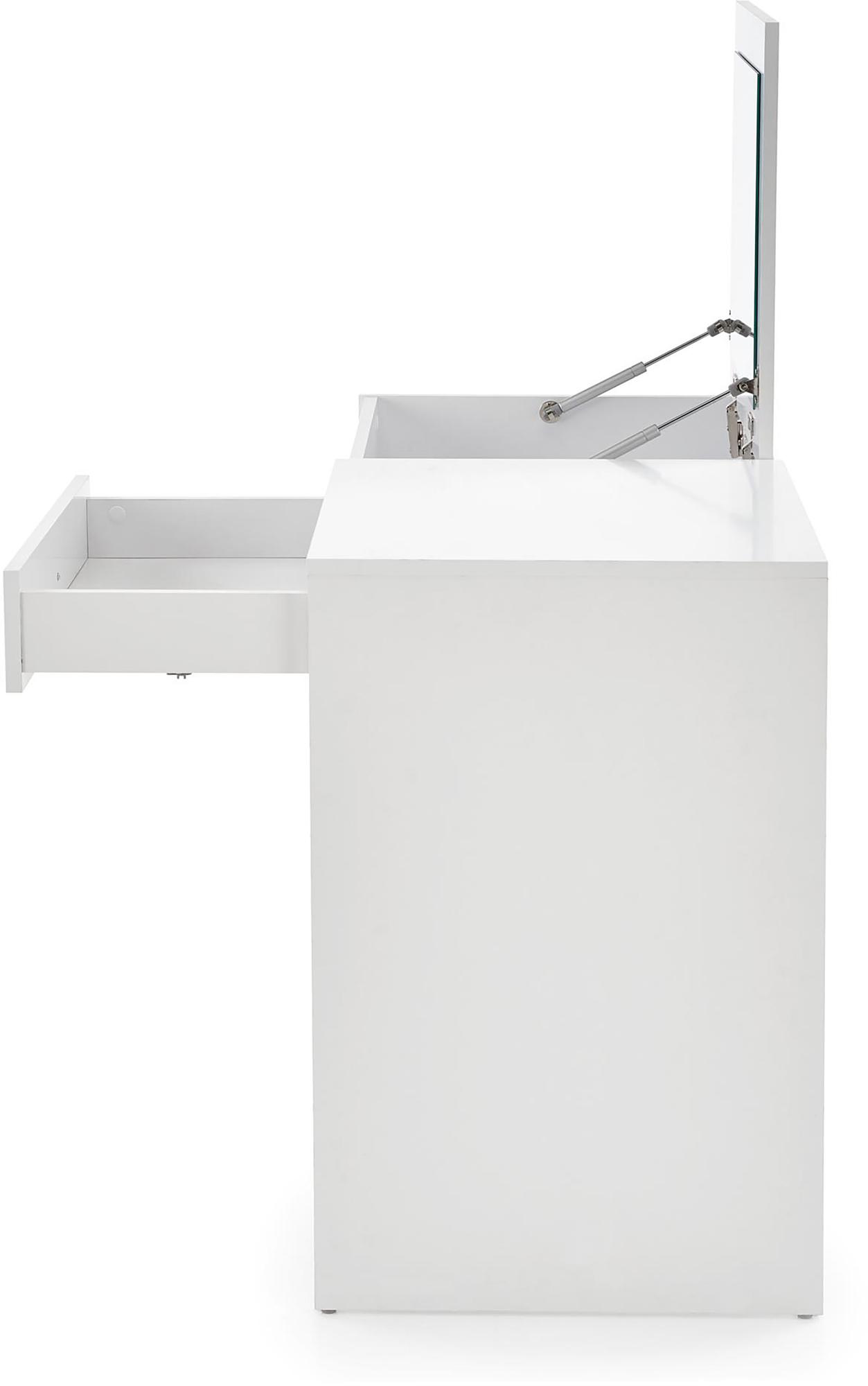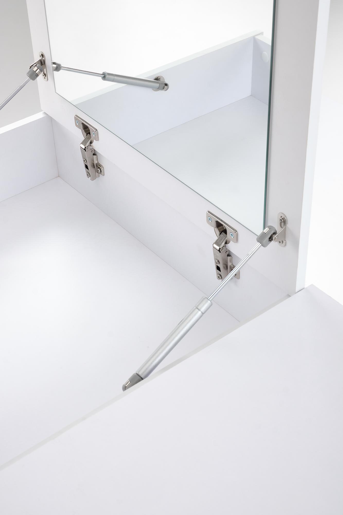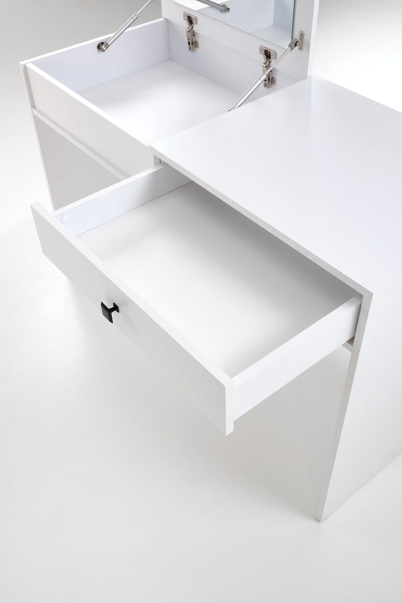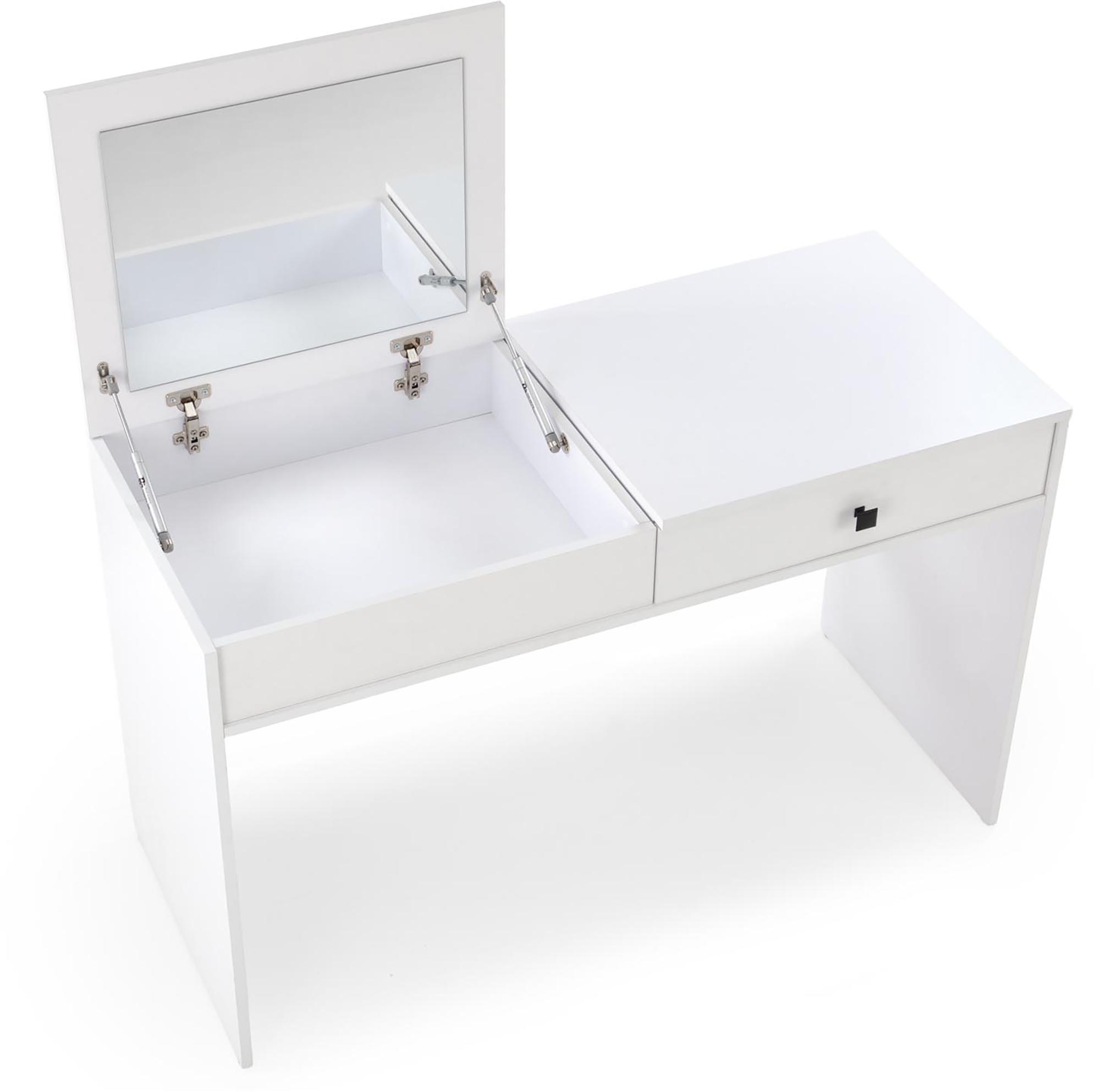 Valge kergesti hooldatav meigilaud, millel on tõstetava kaanega peegel ja mitu praktilist panipaika.