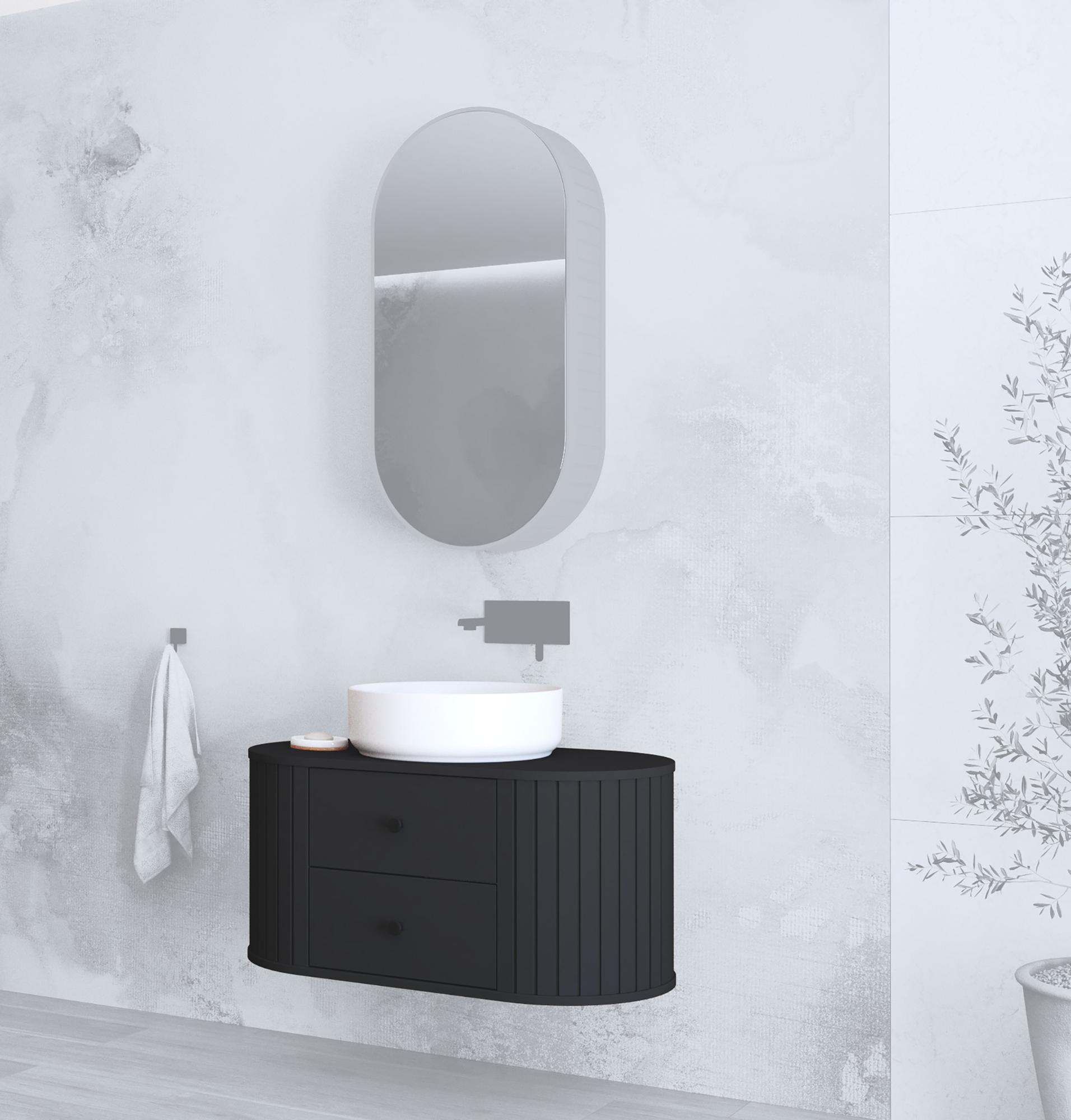 Loiske valamukapp, must – erakordselt stiilne ja modernne vannitoamööbel, kus skulpturaalne disain kohtub praktilise hoiuruumiga.