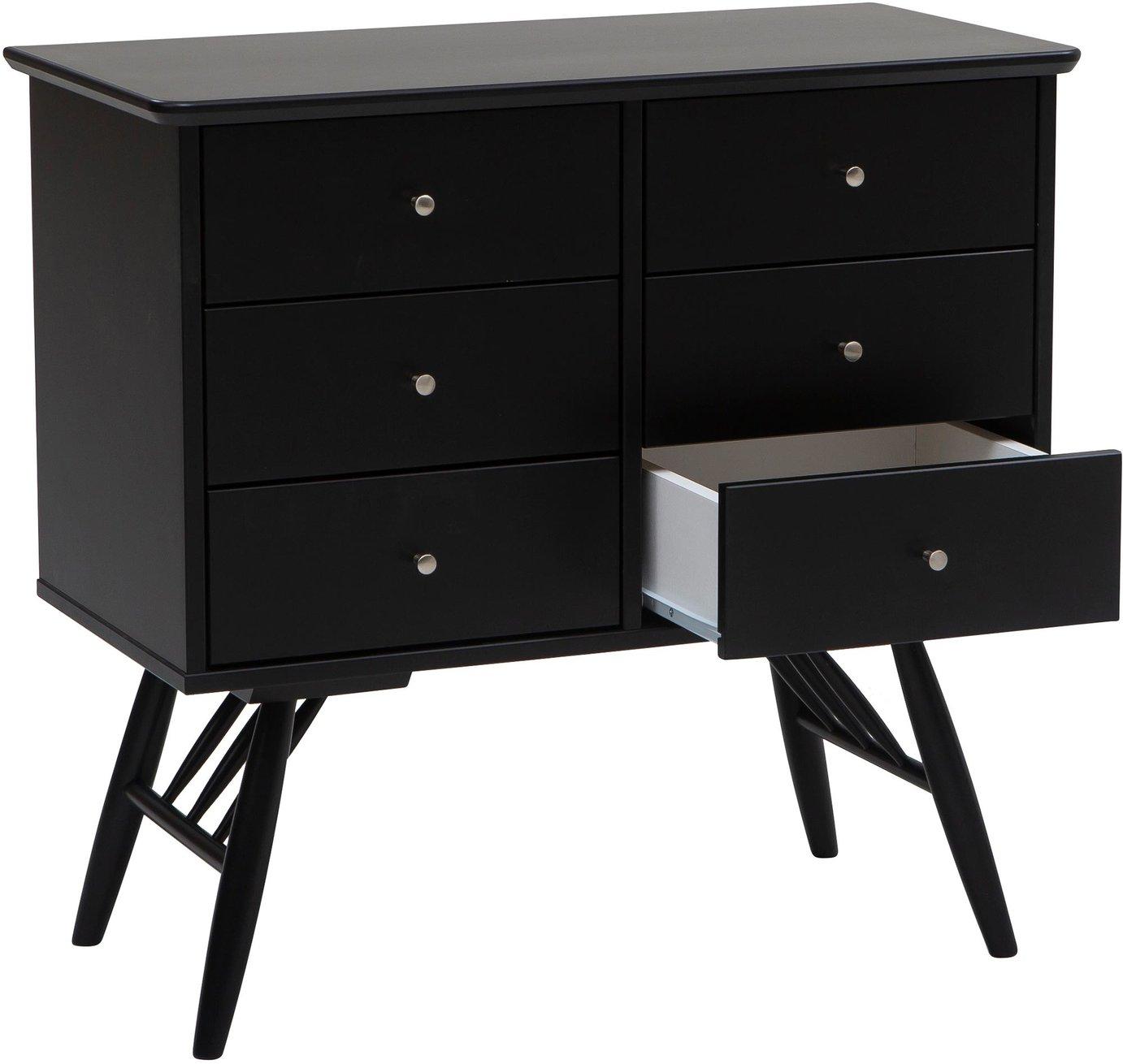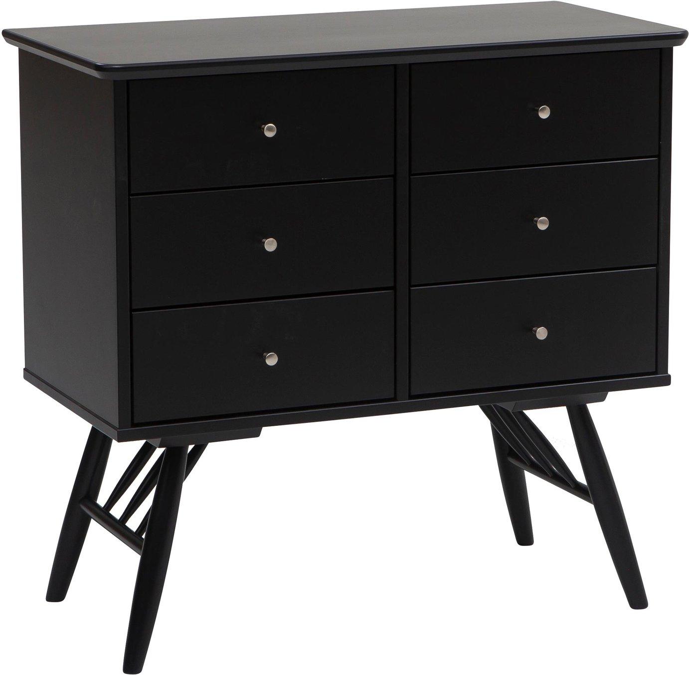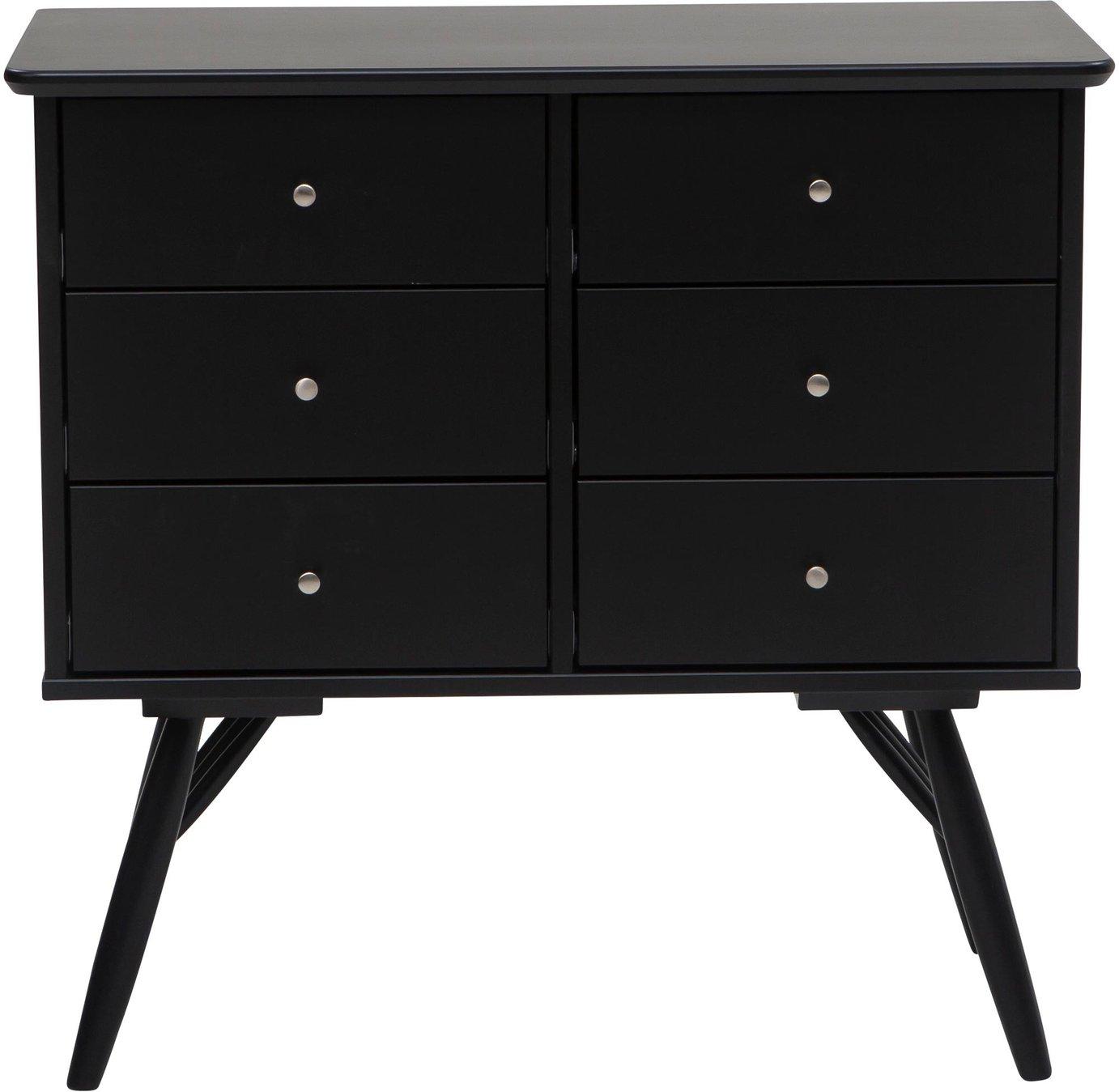 Mõõtmed: 78x40x105 cm Kummutil on kuus avarat sahtlit, mis pakuvad palju hoiuruumi riiete, aksessuaaride, raamatute ja muude tarbeesemete jaoks. Must värv loob teie interjöörile moodsa ja stiilse ilme. Valmistatud vastupidavast kasepuidust ja MDF-materjalist.