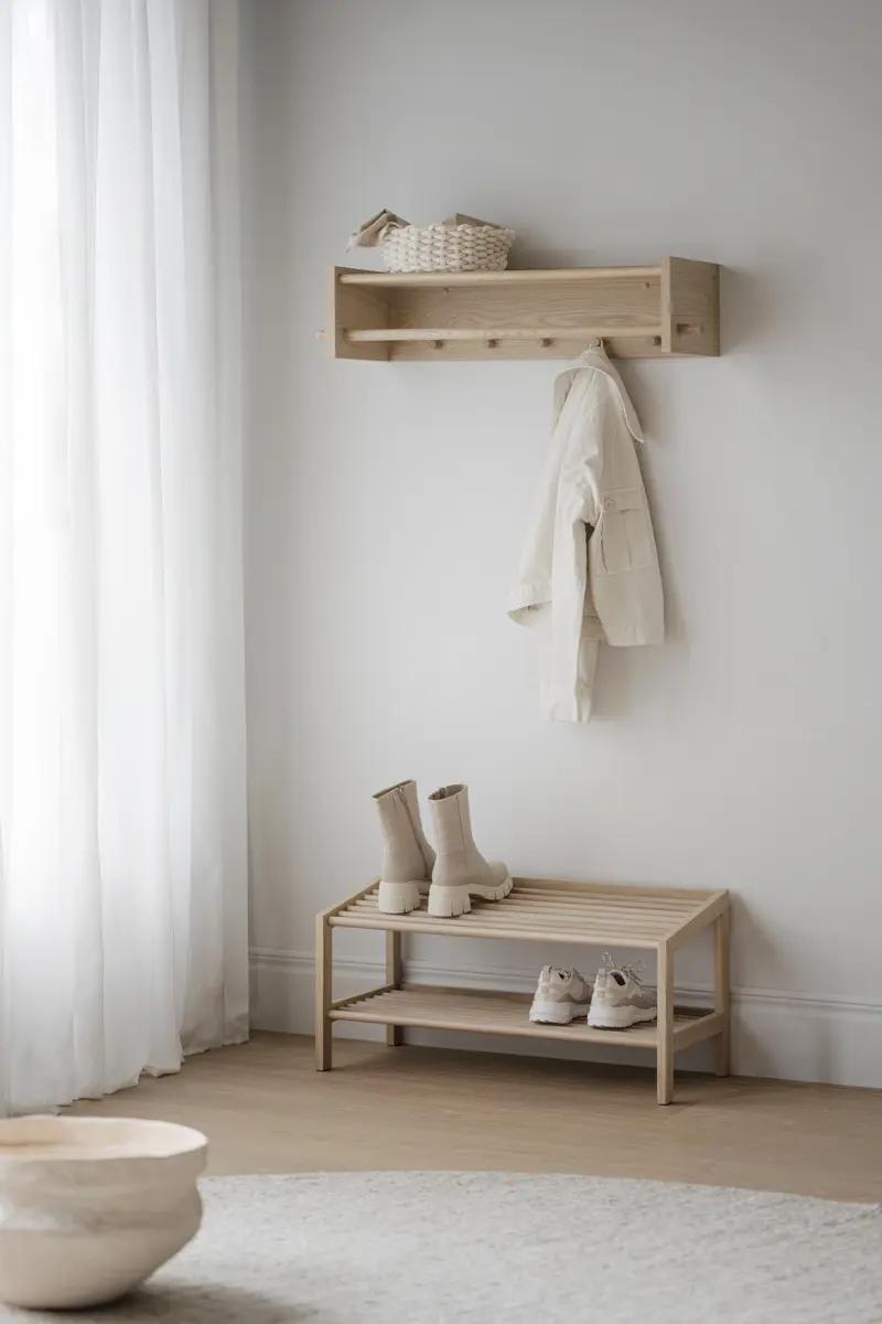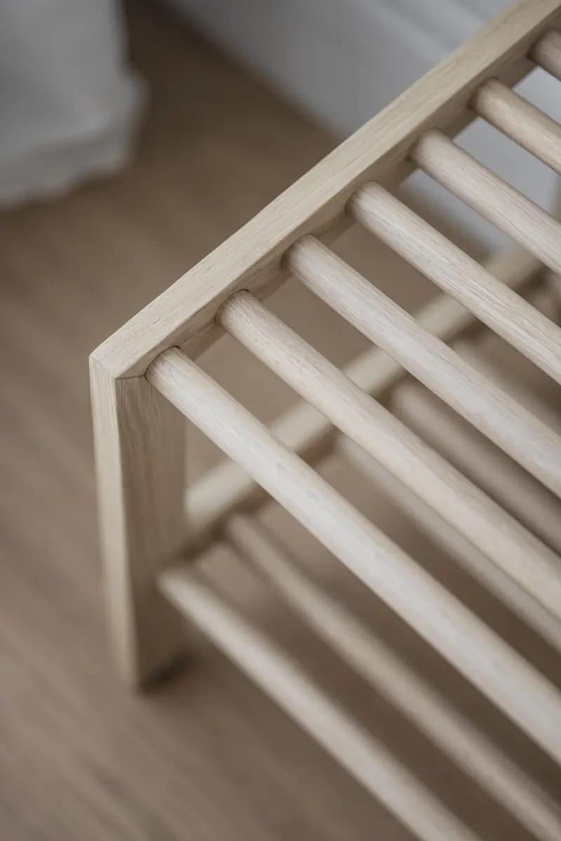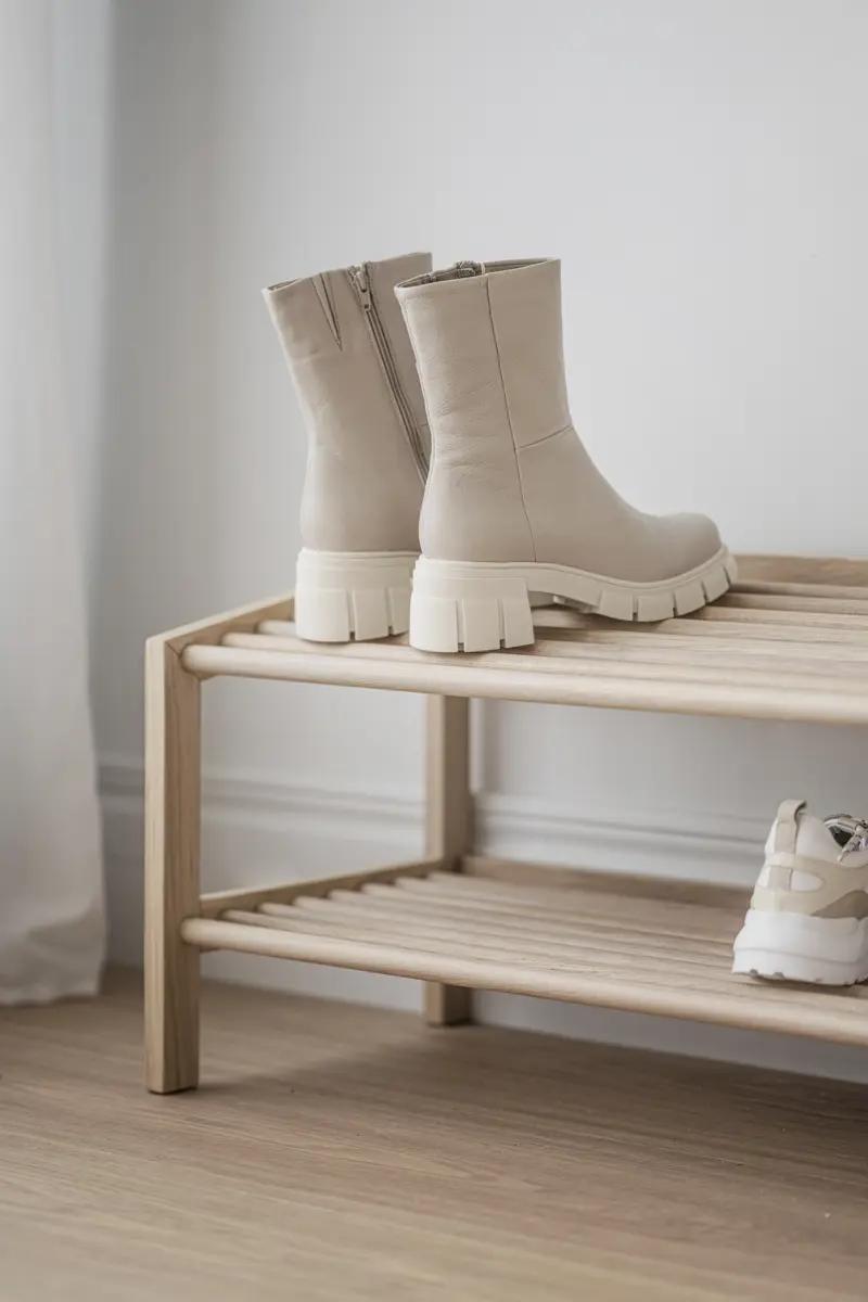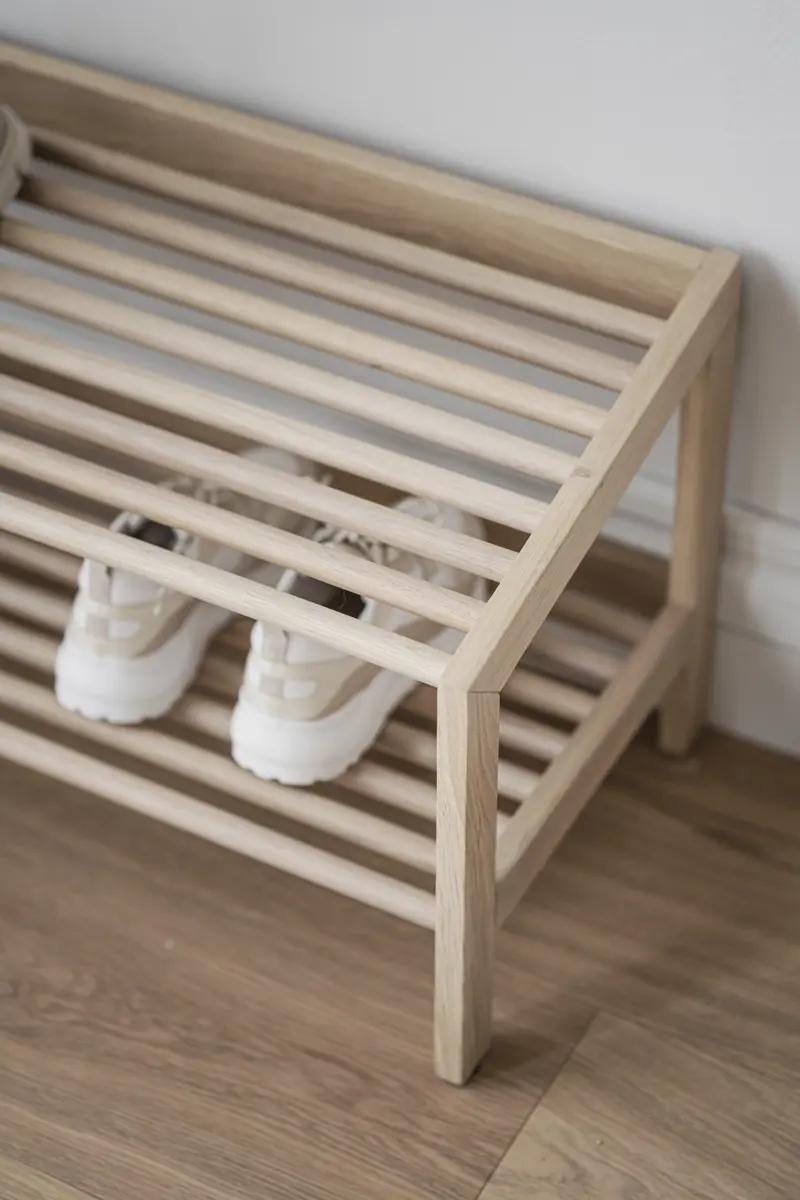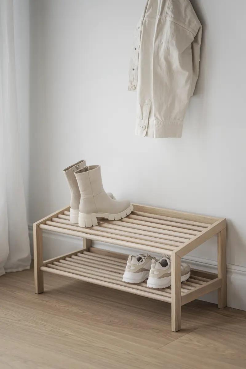 Valgendatud täistammest jalanõuderiiul kahe riiuliga. Praktiline ja modernne disain, sobib hästi esikusse.